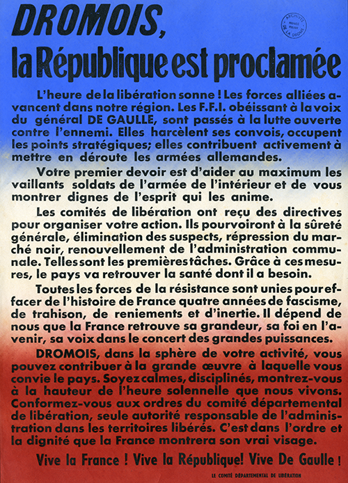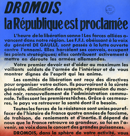 À l’été 1944, le régime de Vichy s’effondre. Dans la Drôme, les comités de Libération remplacent les autorités en place. La République revient, portée par les idéaux de la Résistance et le souffle d’une démocratie renouvelée.