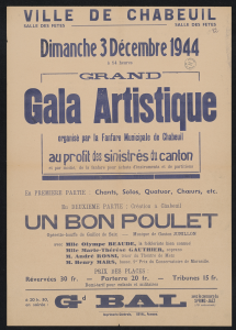 Affiche du gala en faveur des sinistrés du canton de Chabeuil organisé par la fanfare de la ville, 3 décembre 1944.