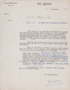 Réponse du maire de la Chapelle-en-Vercors au sous-préfet de Die au sujet d’une personne résidant en Algérie qui propose une aide matérielle à une famille « sinistrée et malheureuse » comprenant une fillette d’une dizaine d’années, 9 novembre 1945.