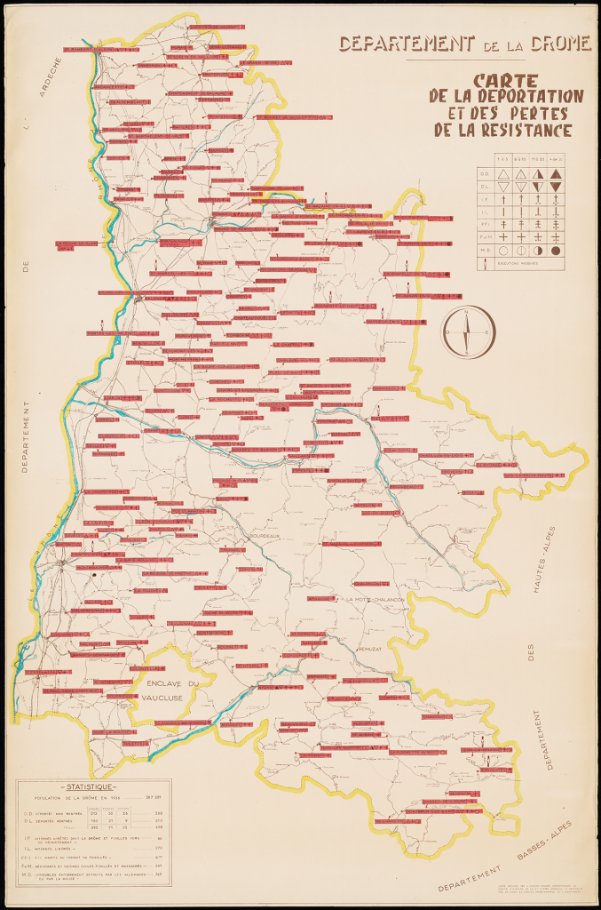 Carte de la déportation et des pertes de la Résistance dans la Drôme dressée par André Vincent-Beaume. s.d.