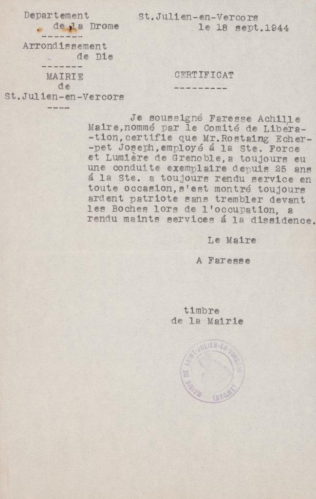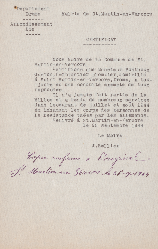 Certificats de bonne conduite délivrés par les communes de Saint-Martin-en-Vercors et Saint-Julien-en-Vercors.