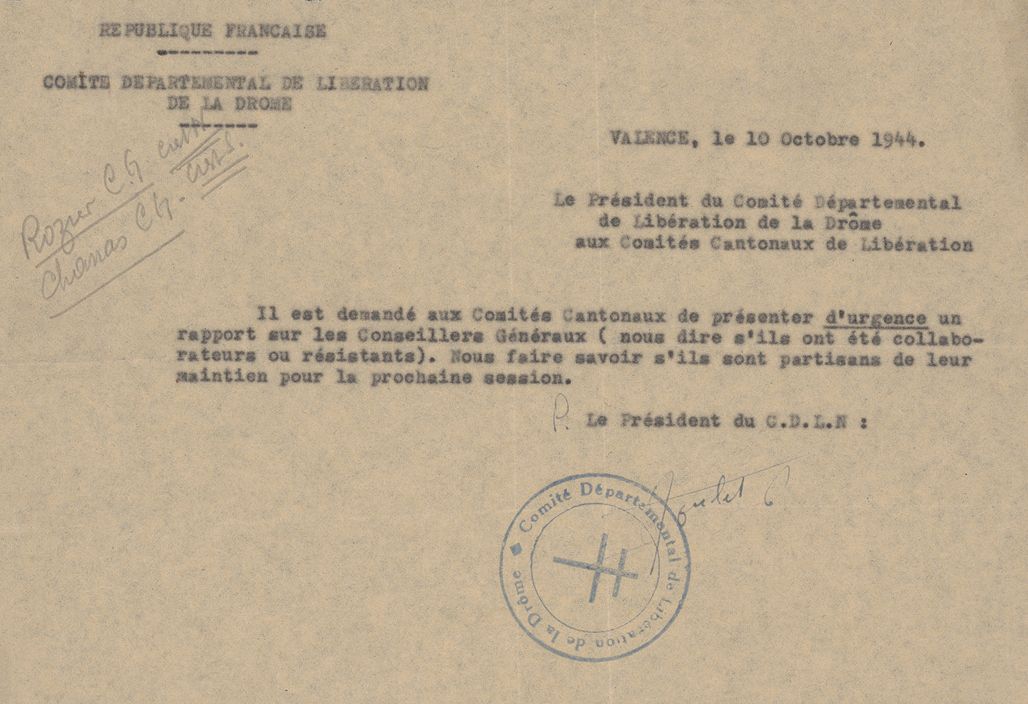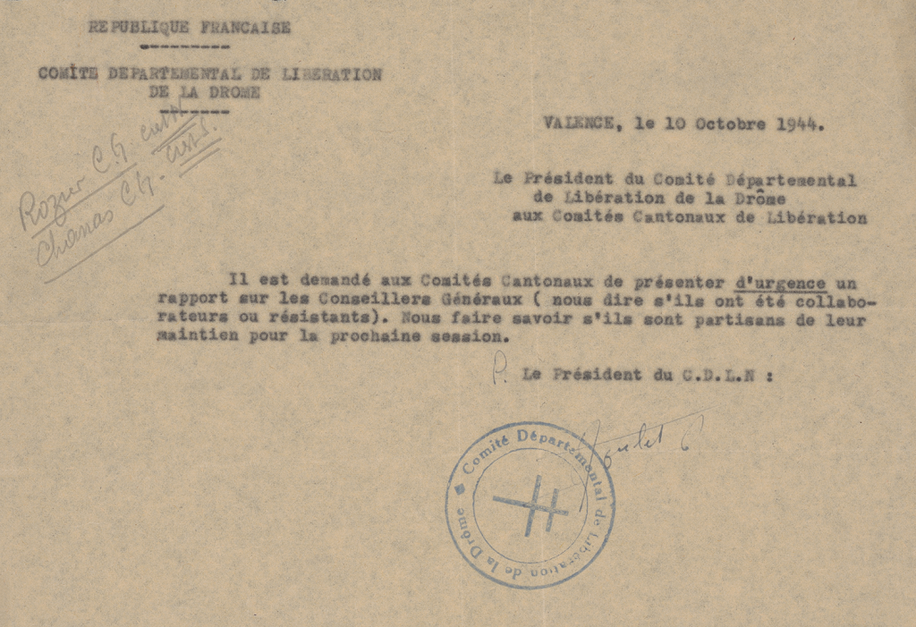 Les comités locaux de Libération sont chargés de recueillir des informations fournies par les citoyens sur les activités ou les agissements des suspects. Ils rassemblent les premières pièces constitutives d’un dossier préliminaire. Cette première étape peut donner lieu à la rédaction d’un rapport transmis au préfet. Celui-ci autorise l’arrestation si elle est nécessaire.