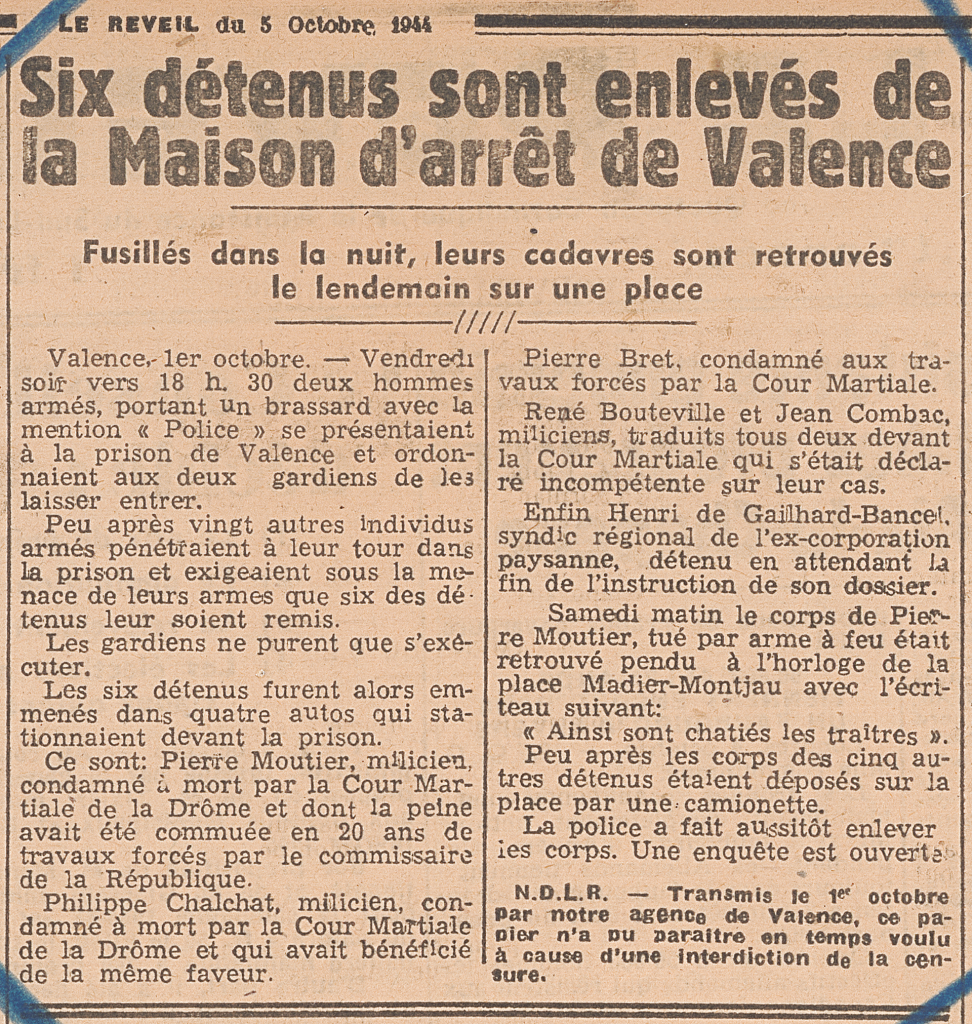 Ces actes alimentent la colère de certains Drômois qui jugent les peines trop clémentes. Des groupes civils se forment et s’autoproclament « justiciers ». Le 1er octobre 1944, des individus s’introduisent dans la maison d’arrêt de Valence et enlèvent six prisonniers. Ceux-ci sont retrouvés morts, fusillés, dans les jours qui suivent.