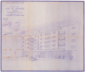 Plan des façades de l’immeuble de l’îlot 6 du Faubourg Saint-Jacques à Valence, dressé par les architectes Maurice Biny et Jean Brunel le 31 mars 1947.