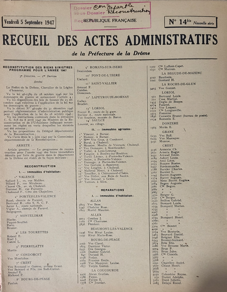Le programme de reconstitution des biens sinistrés pour l’année 1947, publié dans le Recueil des actes administratifs de la préfecture de la Drôme, 5 septembre 1947.